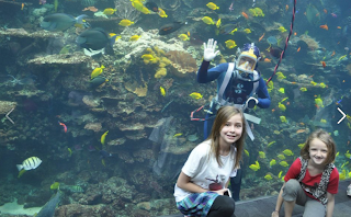 Almost every aquarium we've been to has a tunnel now, but this one had a moving walkway you could stand on. That was pretty cool. Here's the girls and Bobby pretending to surf on the walkway.